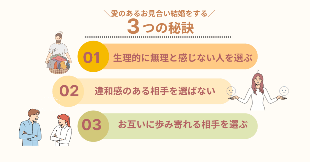 また、愛がないお見合い結婚をしないための秘訣は3つありましたね。