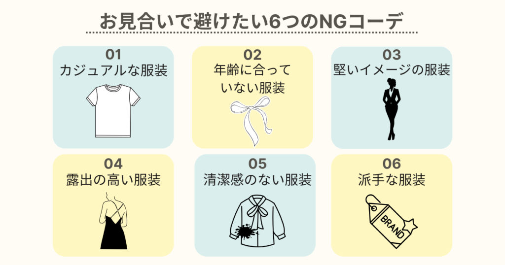 - デニムやTシャツなど、カジュアルすぎるアイテムは避ける
